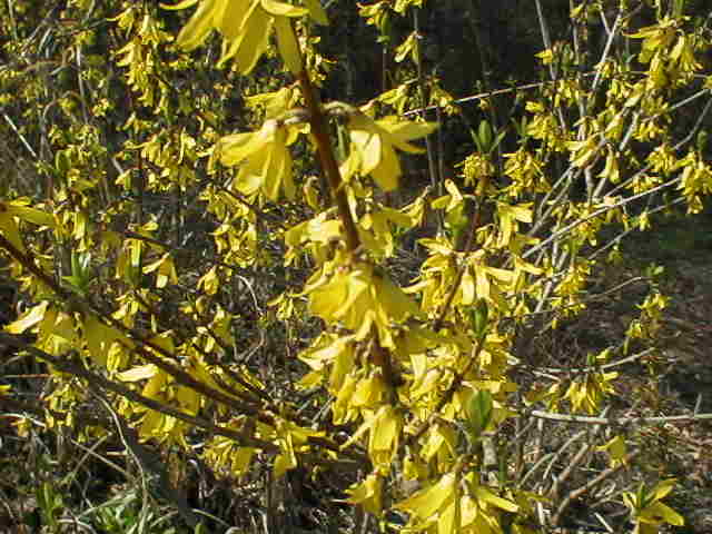 | 高さ約3mで樹皮は淡黄褐色,上部の枝はつる状に垂れる | 3〜4月 | 早春,葉に先立って黄色の筒状の花を多数つける。春を告げる花として有名である。花冠の先は4深裂して十字状に開く。 | 若枝には稜があり,髄は中空となる。葉は対生し,楕円形で鋸歯がある。しばしば3出複葉状に分岐した葉をつけることもある。 |