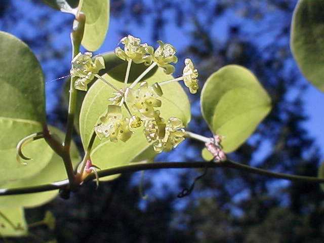 | 丈は40cm位になる。 | 4〜5月 | 葉腋から短い柄をもった散形花序を伸ばして百合ににた多数の花を球状につける。内外の花被片は各3枚で黄緑色,長さ4〜5mmである。 | 葉は径5〜10cmの円形ないし楕円形で,質が厚く表面に光沢がある。葉柄の基部には托葉があり,その先端が伸びて巻きひげになる。 |