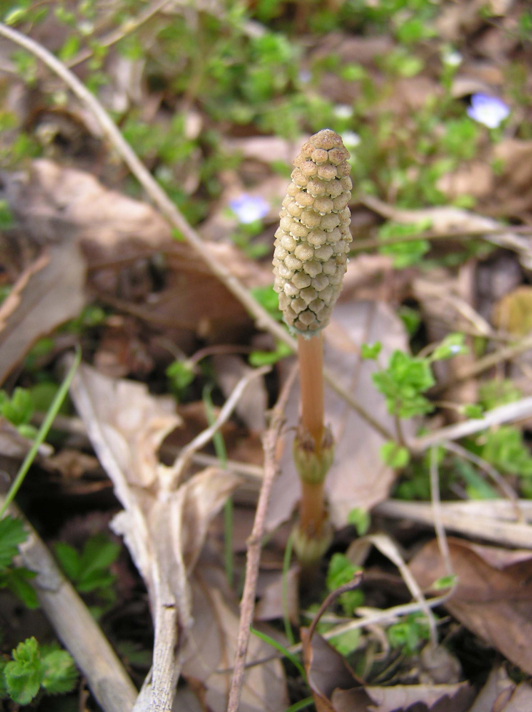 トクサ科多年生のシダ植物。 北半球の温帯に広く分布している。原野,路傍,堤などいたるところに生えている。早春の頃,つくしと呼ばれる胞子茎を出す。高さ約20cm,茎頂に多数の子嚢托から成る長楕円形の穂がある。子嚢托は六角形状で裏側の中央に柄があり,その周囲に5〜10個の細長い胞子嚢がある。胞子茎は胞子を飛ばしたあとに枯れる。胞子には特有な弾糸が付着し,これは乾くと伸びて広がり,湿ると胞子に巻きつく運動をする。伸びはじめの若いつくしは,あえ物などにして食べる。 |