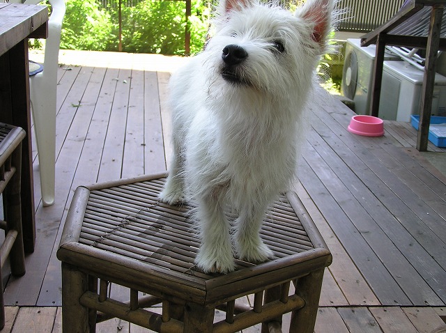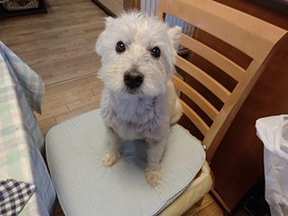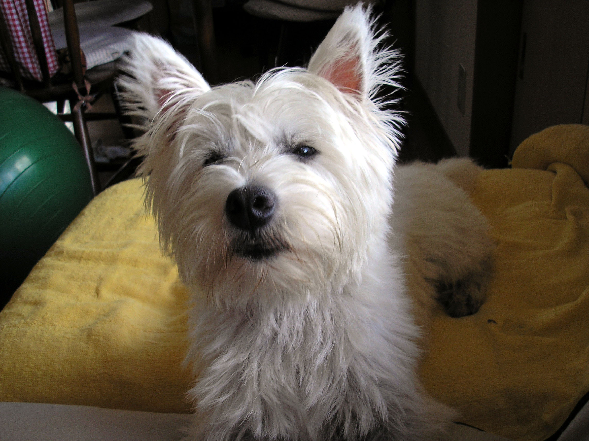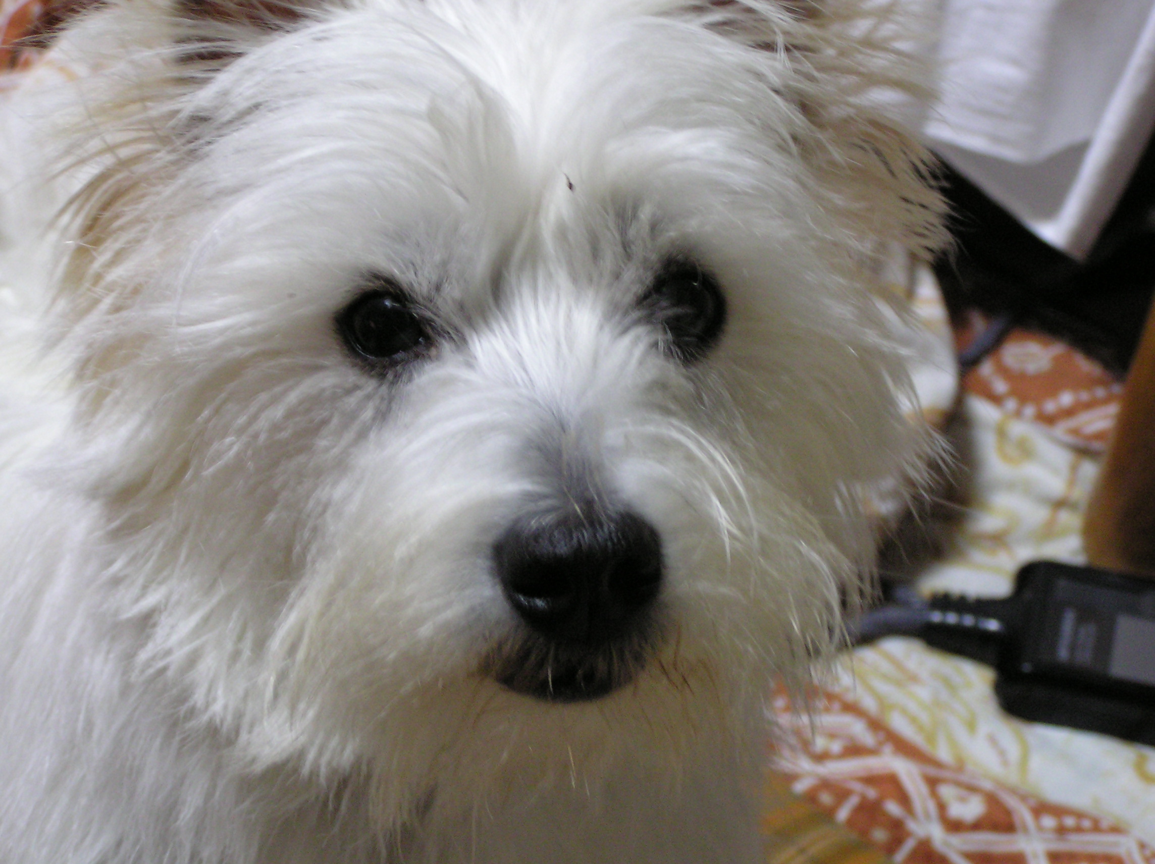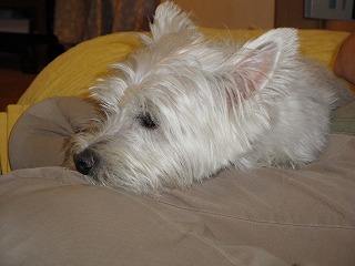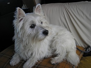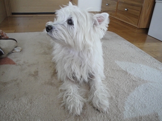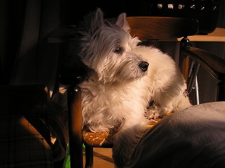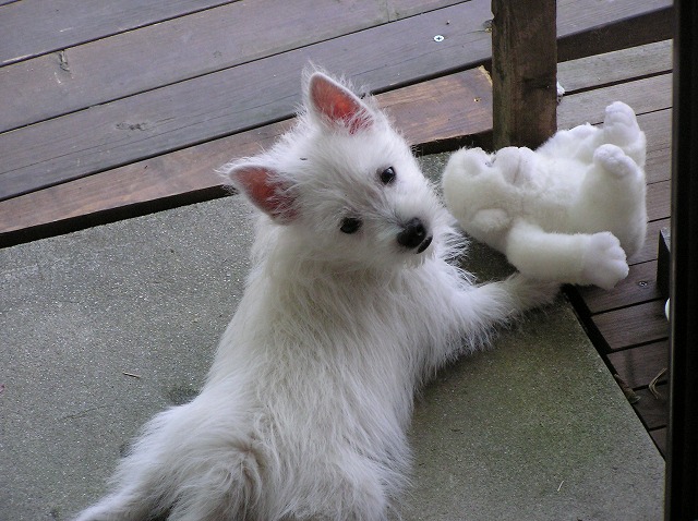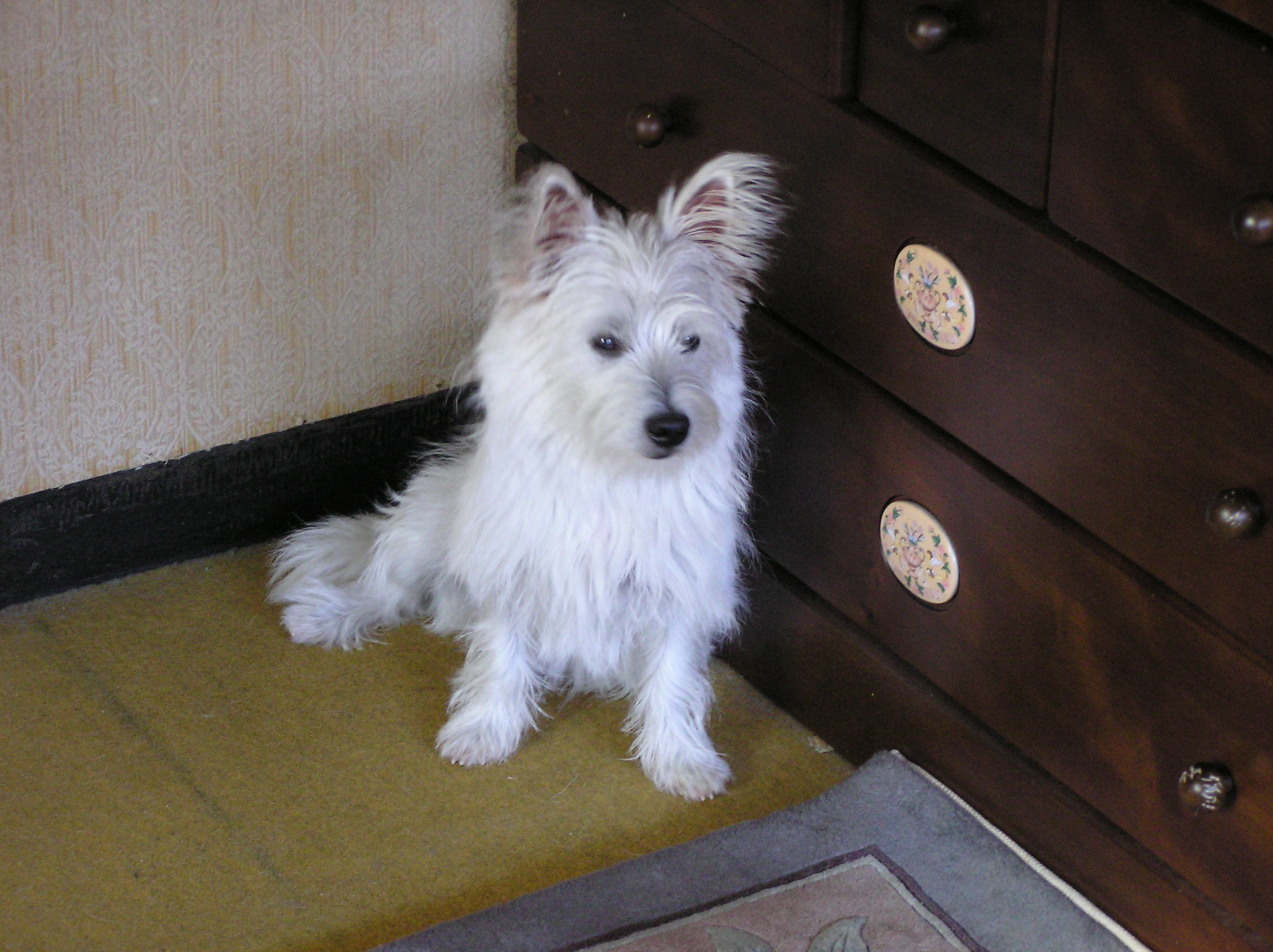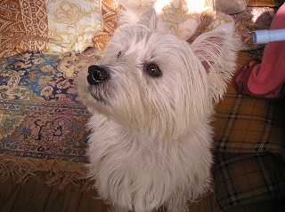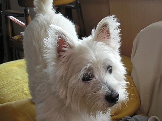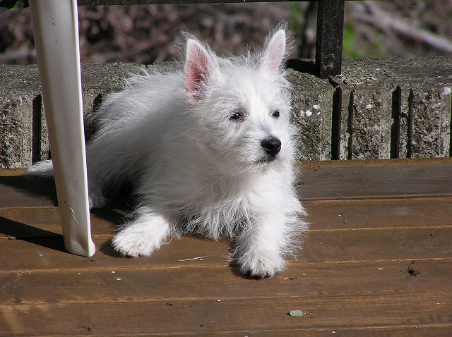 キキはウェスティです。これから我が家の一員です。(04-5-23)3月生まれです。 ウエスティ=ウエスト・ハイランド・ホワイト・テリア ドッグフードのシーザーのコマーシャルに出ているあの子です. |