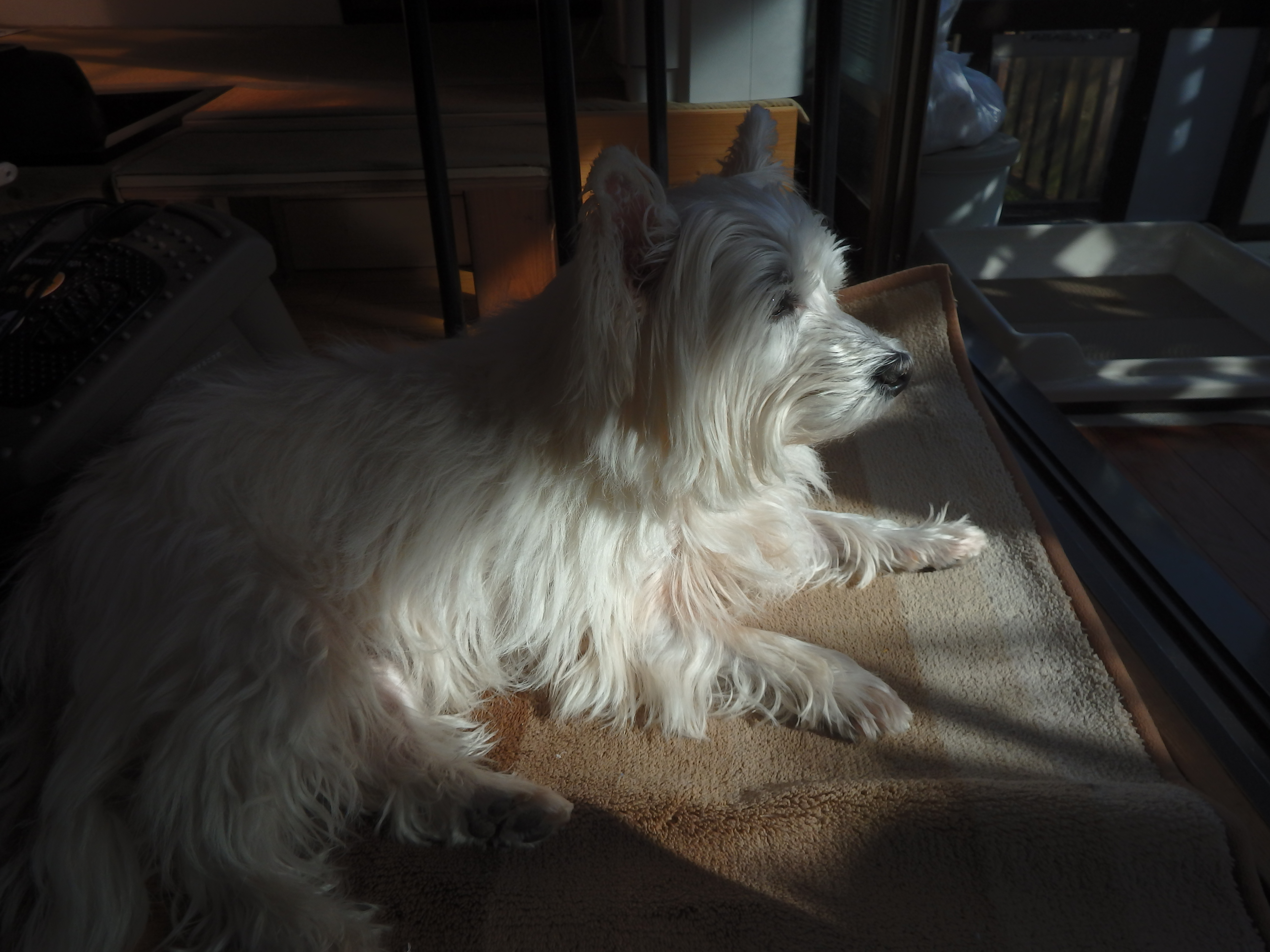 裏のデッキでひなたぼっこです。暑くても気にならないようです。 |